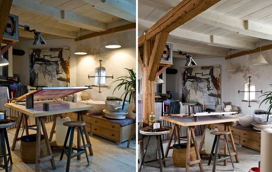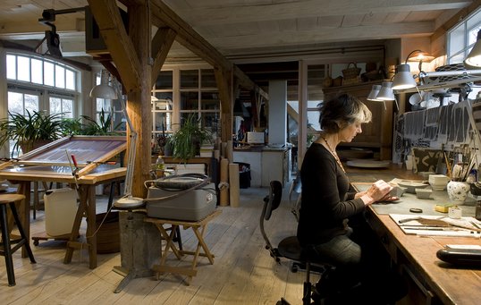 Og halvdelen af stueetagen har, siden børnene flyttede hjemmefra, ageret værksted. Den store indbyggede seng i hjørnet er eneste levn fra den tid, hvor rummet var sove- og legeværelse for en familie på fire. Nu er der i stedet fyldt med Ane-Katrine von Bülows keramik, mønsterskabeloner på store rammer og stakkevis af tryk på silkepapir.
