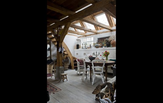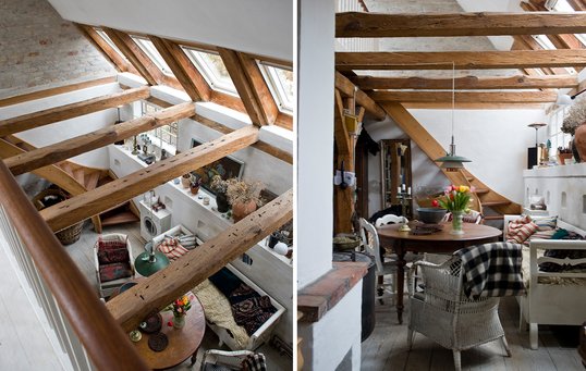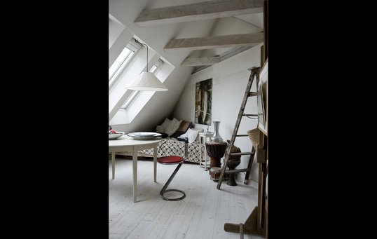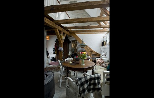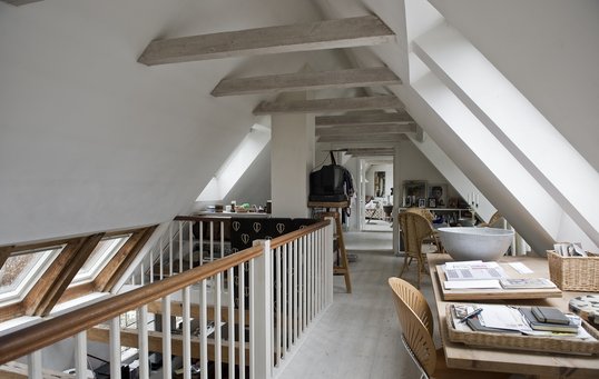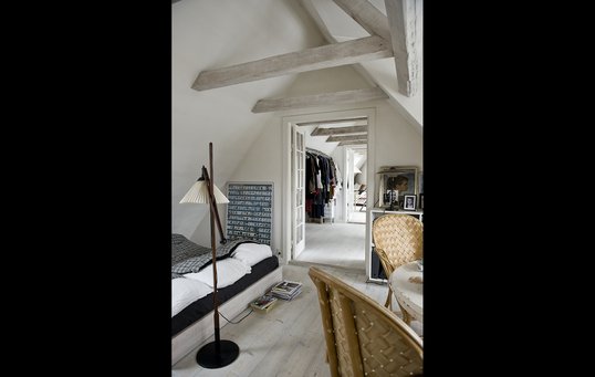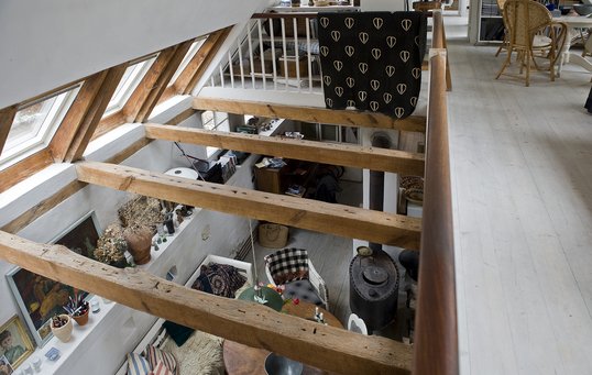 For 18 år siden fik hun også udnyttet førstesalen. Heroppe er et mørkt og støvet loft blevet til en lys og luftig etage med lækre plankegulve og flere specialbyggede møbler. Udnyttelsen af loftet gav også mere lys til stueetagen, fordi Ane-Katrine von Bülow lyttede til en håndværkers råd om at fritlægge en række gamle bjælker og åbne et stort parti op til taget.