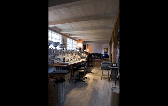 Og så er der adskillige arbejdsborde, som giver plads til hendes arbejde med at trykke mønstrene på de store skåle, vaser og krukker, som hun støber, glaserer og brænder på et keramikværksted på en villavej i Hellerup.