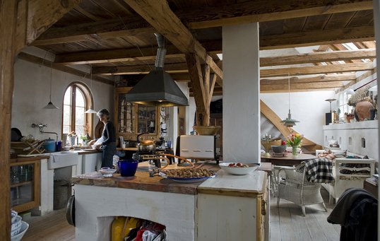 Og der er så mange historier i huset, der blev bygget som ammunitionslager til militæret i 1778, at man med det samme føler sig hjemme – midt i mellem den hvide slagbænk med alle puderne og tæpperne og de gamle skydehuller i væggen, lamper, bøger og kunstværker, som titter frem overalt.