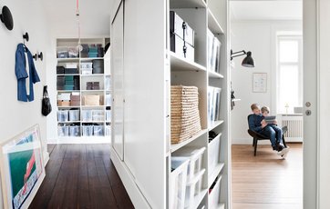 I denne Københavner-lejlighed er de lange gangarealer omdannet til praktisk opbevaringsplads med indbyggede skabe og reoler. Lejligheden er ombygget med hjælp fra arkitekt Jens Lind, og de mange skabe har vist sig at være svaret på stort set alle de opbevaringsudfordringer, man står med som stor familie i en lejlighed.