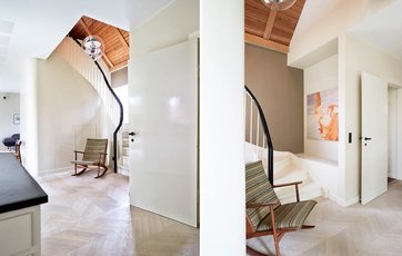 Da arkitekten Anders Barslund overtog et hus fra 1950’erne, fik han den helt rigtige legeplads til at eksperimenter med farver. Væggen ved den nye trappe til førstesalen er malet i en mørk, gråbrun farve, og det blanke, sorte gelænder passer perfekt til 1950’er stilen. Gyngestolen har tilhørt arkitektens far og har en ganske særlig betydning.