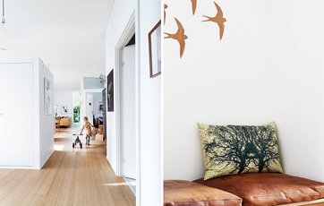 Varme og naturlige materialer byder velkommen i entreen i dette nybyggede hus. Bambusgulvet matcher de patinerede læderhynder og de træfarvede wallstickers. Garderobeskabene er indbygget i den fritstående væg, der fungerer som rumdeler mellem entre og køkken-alrum. Den lille bænk er praktisk, når familiens børn skal have sko på.