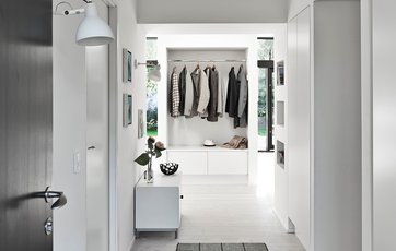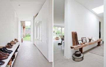 Et traditionelt typehus fra 1960’erne er her forvandlet til en lys og moderne drømmebolig. Den lange gang, som denne hustype ofte er født med, er indrettet med højglanslakerede garderobeskabe, og lange, svævende hylder til sko. I den modsatte ende står en gammel bænk med familiens rejseminder og lys.