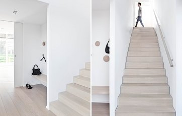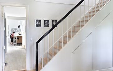 Familien i denne arkitekttegnede villa drømte om en hall. Det fik de ikke – og så alligevel. Når de i dag træder ind af hoveddøren er der 5,5 m til loftet og blikket drages automatisk mod lyset for enden af den flotte, brede trappe. I nichen er der blevet plads til bænk og knager.
