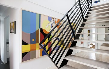 Den åbne trappe er placeret centralt i huset, så den er det første man ser, når man træder indenfor. Et stort, farvestrålende maleri giver liv til trapperummet. Maleriet har hængt på DSB's tidligere hovedkontor, og parret i huset har fundet det på Lauritz.com.