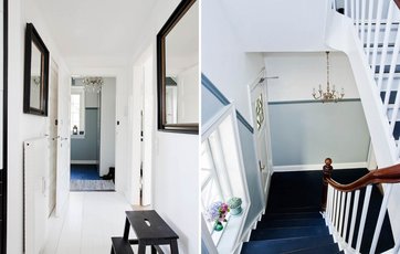 Da arkitekt Thomas Hjort overtog sit drømmehus overtog han samtidig en nedslidt hall med gammel linoleumsbelægning. Men Thomas var vild med den dybe, midnatsblå farve, som man ikke kan få mere i dag. Derfor blev belægningen renoveret og bevaret. Væggene er malet i en lyseblå tone, der matcher gulvet og stilen i det gamle hus.