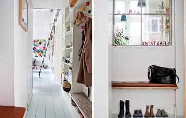 Fortiden som filmrekvisitør manifesterer sig allerede i entreen i denne bylejlighed, som Thomas Abel og hustruen Caroline har bygget om i samråd med arkitekt Gitte Falk. Pladsen er udnyttet til sidste kvadratcentermeter med bænke, knager og reoler fra gulv til loft. Vinduet ud mod køkkenet er et gammelt værkførervindue, som giver ekstra lys i entreen.