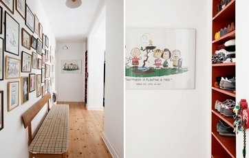 Familien i denne lejlighed er vilde med tegneserier – især Tintin-tegninger. Det hele begyndte med en Tintin-kalender, men da året var omme, rev de alle tegningerne ud og hængte dem op i gamle rammer, som de fandt på loppemarkeder. Siden er samlingen vokset. En knaldrød, indbygget reol holder orden på familiens fodtøj. Bænken er et arvestykke.