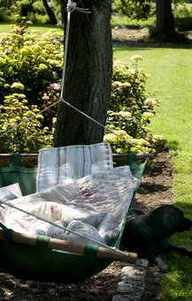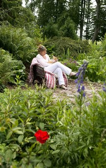 Det dejlige ved haven er, at den hele tiden er i bevægelse, i modsætning til huset, som er statisk. Man kan næsten altid finde et sted i haven, der passer til ens humør. Hvis hortensiaerne blomstrer, sætter jeg mig i nærheden af dem, hvis jeg trænger til at hvile mig, bruger jeg hængekøjen. Jeg tænker meget på, at der skal være noget i haven, som er smukt igennem hele foråret og sommeren.
