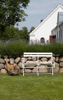 Bænken bag ved det nye lysthus, som Anne Stausholm selv har tegnet.