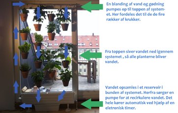 Den lodrette have fungerer som en såkaldt hydrokultur, hvor en blanding af vand og gødning løber fra krukke til krukke via en gummislange monteret igennem bunden af hver krukke.