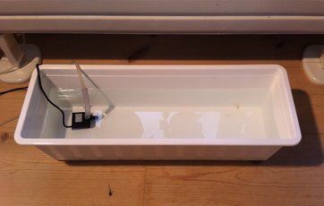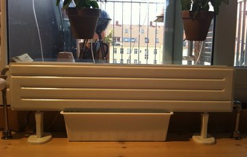 Det vand der cirkulerer, skal selvfølgelig komme et sted fra og have et sted at være. Du skal være lidt kreativ, hvis du vil have en løsning, der ikke bare løser opgaven men også er æstetisk. Her blev løsningen en hvid altankasse, der lige præcis kan være under radiatoren. Det er både diskret og praktisk.