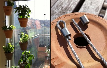 Krukkerne hænger på tynde, coatede stålwirer. I byggemarkedet kan du købe wirer og små klemmeringe, så du kan lave løkker for enden. Løkkerne gør det nemt at hænge wirerne op.