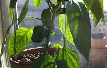 Du behøver ikke kun nøjes med at plante basilikum og persille - du kan sagtens eksperimentere med større planter, fx gror peberfrugter fint i en vindueshave, hvilket ses her.