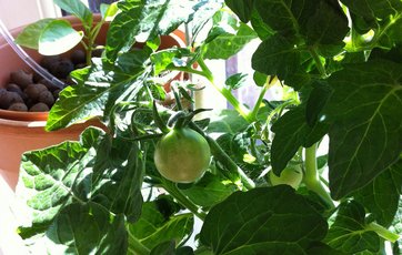 Også tomatplanter egner sig fint til vindues-haver. Her begynder små tomater at tage form. De mindre tomattyper som cherrytomater og blommetomater er bedst egnet.