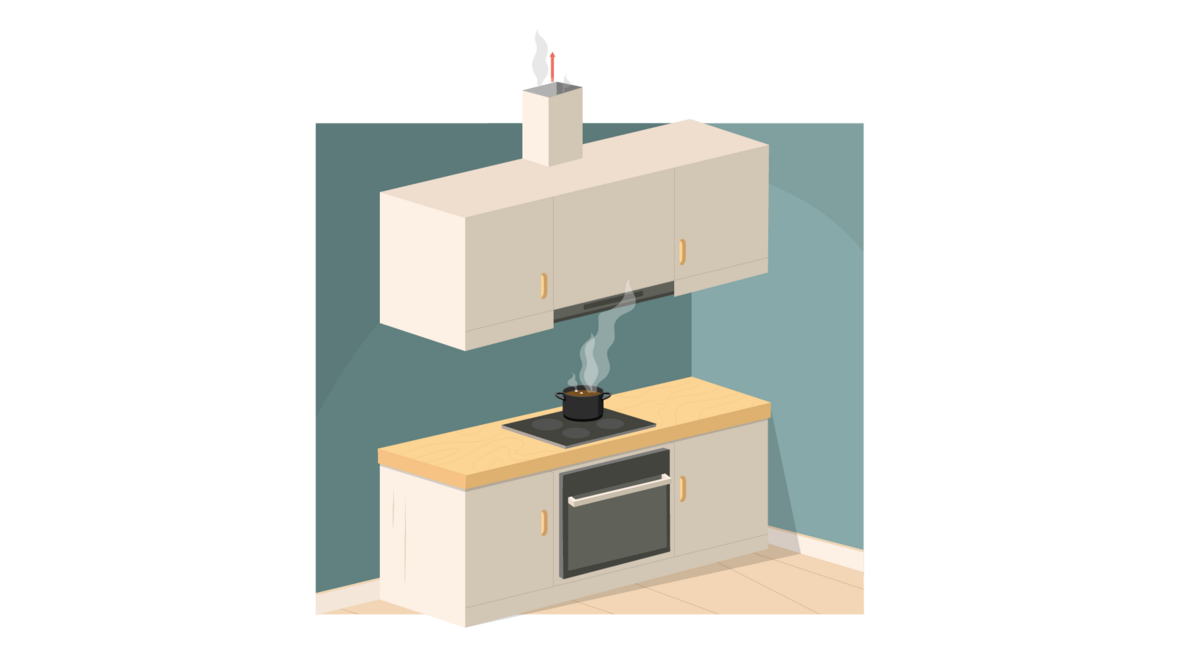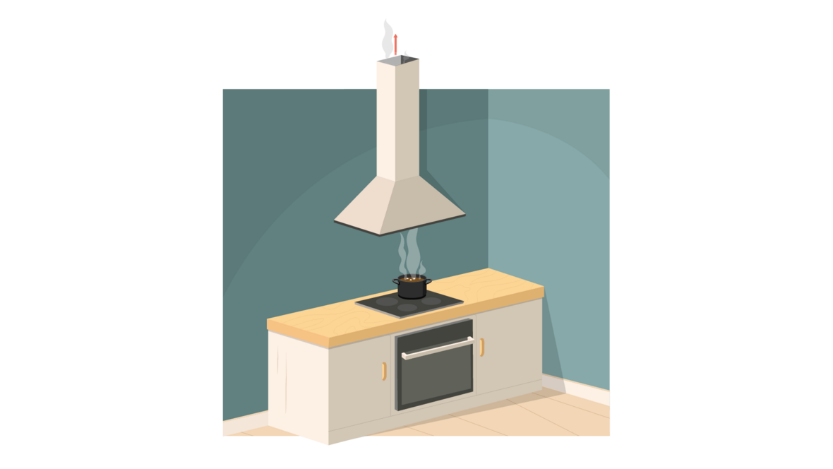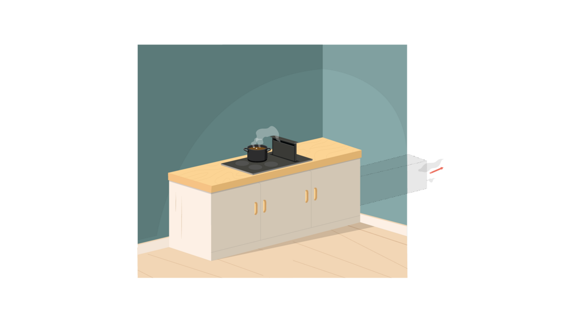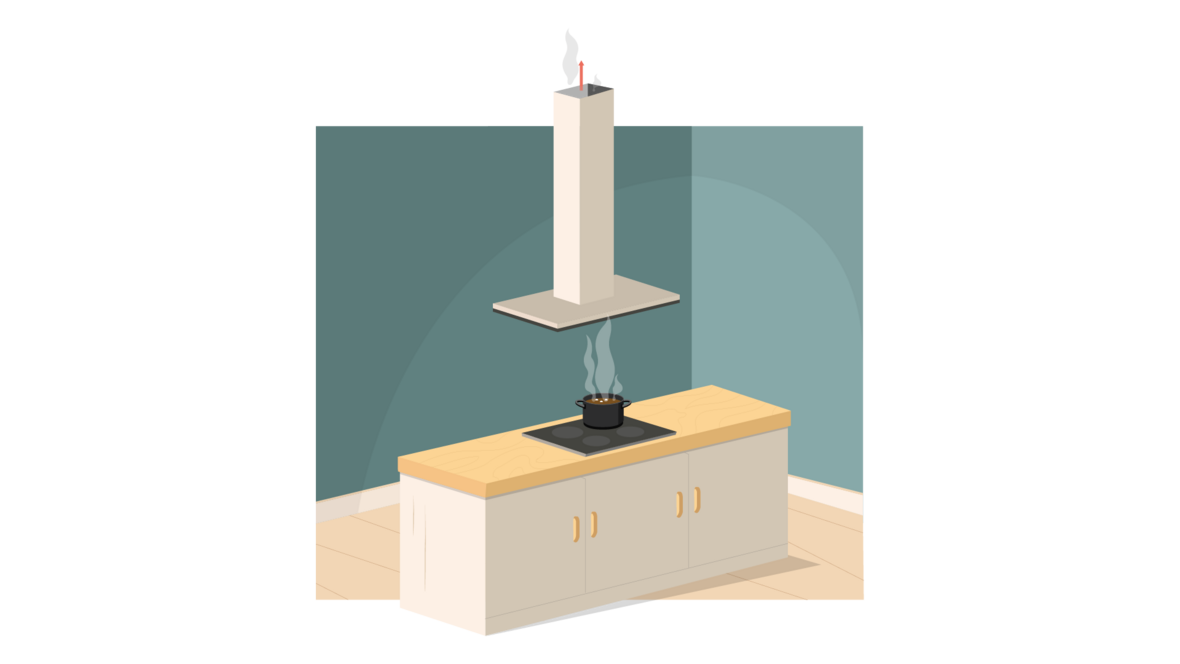 Ved en frithængende emhætte placeret over en kogeø vil der typisk være en større spredning af partikler til resten af boligen, end hvis komfur og emhætte er placeret langs væggen.