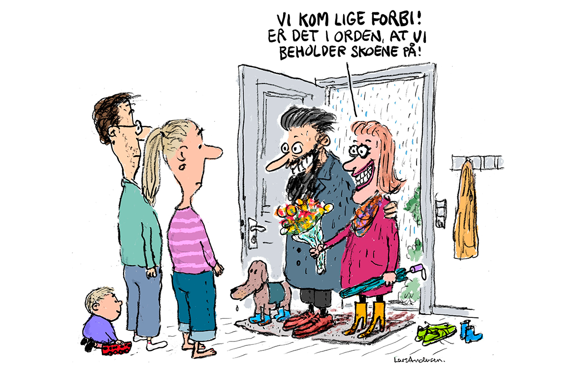 – Det er uforskammet at vade ind i møgbeskidte sko, men det er lige så uforskammet at bede folk om at tage deres pæne sko af. Når min kærestes jyske venner besøger os, så råber jeg altid ud til dem i entreen: Behold bare skoene på! Vi er ikke i Jylland!