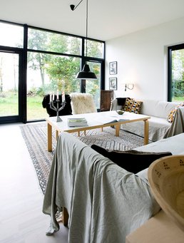 - Vores valg af hus gav sig selv. De store glaspartier ydede fuld retfærdighed til de bakkede marker med græssende heste og køer mod syd. Det ville slet ikke være det samme at se ud af små bondehusvinduer i det her landskab, fortæller Mette Hilden, da Videncentret Bolius talte med hende i 2013.