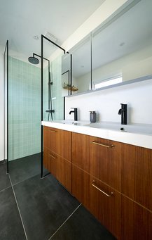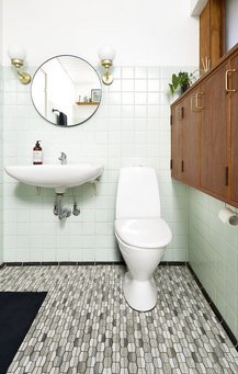 Både for at spare penge og sikre, at huset har bevaret sit oprindelige 60’er-udtryk, har genbrug været et gennemgående tema. Det ene af de oprindelige badeværelser har blot fået en let opfriskning, mens fliser fra det oprindelige køkken forsigtigt er blevet taget ned og genanvendt som stænkplade i det nye køkken.