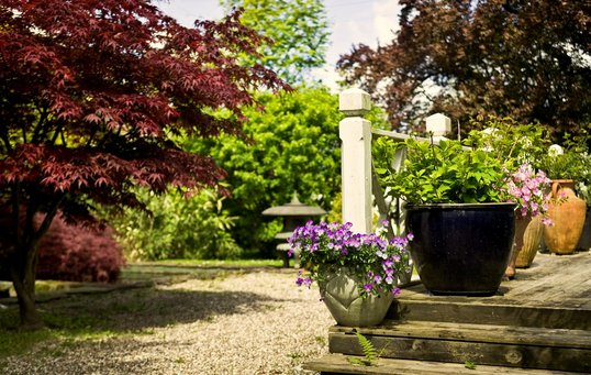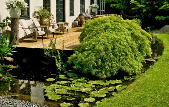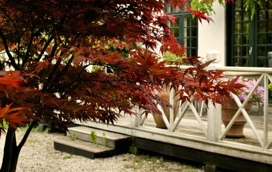 - Jeg brugte en del tid på at studere japanske løn (Acer Palmatum - i daglig tale kaldet japanske ahorntræer, af hvilke der findes et utal af forskellige arter). Undersøgte hvilke der bedst kunne trives i vort klima, hvor store de kunne blive, etc. Og så ønskede jeg et miks af buske og træer og en variation af farver - fra det irgrønne nærmest selvlysende til de helt mørke røde, fortæller han.