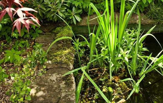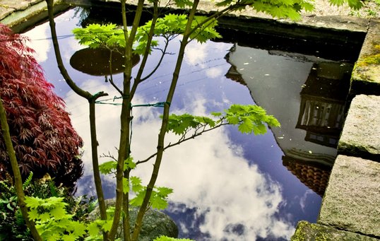 Udover træer og buske hører der sig også bassiner til i en rigtig japansk have. Den rislende lyd er en vigtig del af helhedsoplevelsen. Vandet har en beroligende egenskab, og samtidig reflekterer det lyset rundt omkring i haven.