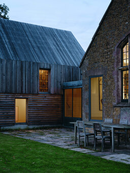 Et gammelt hovedhus i sten har fået en ny tilbygning i træ. Foto: Francesca Ióvene