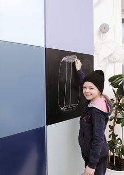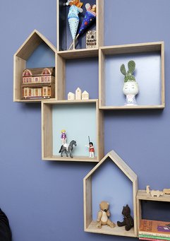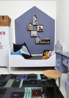 Og for at undgå et rum helt i blåt, som nu er Floras yndlingsfarve, er væggene malet hvide. Det hvide brydes af ”det blå hus”, som indrammer Floras seng.