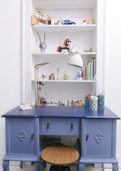 Alle møbler er malet i blå nuancer, og stort set alt på værelset er genbrug – det er med til at gøre rummet mere personligt, mener Floras mor.