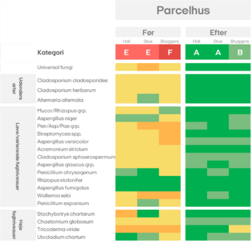 I alle tre huse er forekomsten af skimmelsvamp markant forbedret efter renoveringen, således at de fleste rum nu ligger i kategori A eller B.