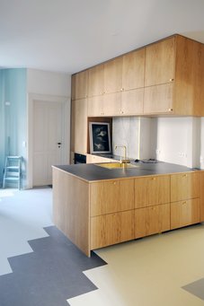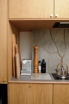Det unikke ved vores køkken er, at da min mand selv har stået og lagt finéren på, kunne han sørge for, at årerne passer fra gulv til loft, hvilket giver et roligt udtryk. Desuden har det været muligt netop at vende årerne på højkant i stedet for på bredden, som det oftest ses.