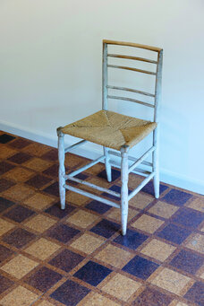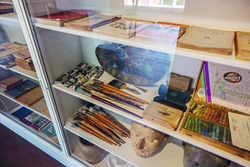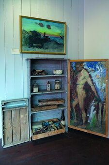 Det store rum på første sal fungerede som vinteratelier og havde store vinduer mod havet og haven, så motiverne kunne hentes ved blot at se ud ad ruderne. Bordet i midten med stenplade står originalt med malerklatter.