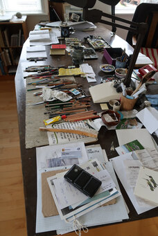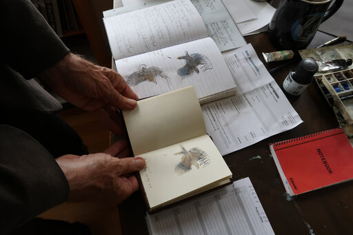 Og så noterer han, tegner og maler i sin Mayland-kalender og i sine notesbøger. Side efter side, bog efter bog, er fyldt med smukke, detaljerige illustrationer af tornskader, skarve, havørne, stillidser, strandskader, klyder og rødben.