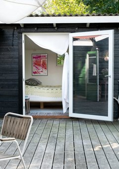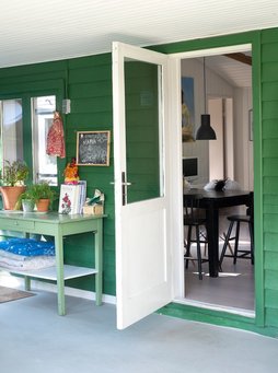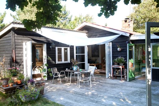 Også udvendigt tog de fat på at ændre husets stil, som gik fra at være lysegråt med dueblå vinduesrammer og dørkarme til den klassiske sorte sommerhusfarve med hvide vinduesrammer og -karme. Desuden byggede de en stor træterrasse, som samler huset, udestuen og annekset til en helhed.
