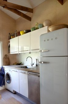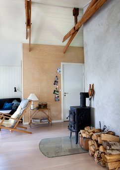 I køkkenet og i overgangen fra stue til køkken kom der krydsfiner på væggene, blandt andet for at markere køkkenet i forhold til resten af det store opholdsrum.