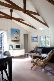 For at få mere lofthøjde i stuen, fjernede de loftet og under det dukkede en arkitektonisk gevinst frem i form af en række saksespær, som sammen med et nyt trægulv, nyt køkken og glasdøre ud til haven fra stue, sidebygning og anneks satte punktum for det anonyme præg, huset tidligere havde.