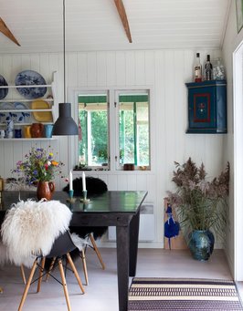 Den hyggelige spiseplads er indrettet med både arvestykker og nye fund. Foto: Jesper Ray.