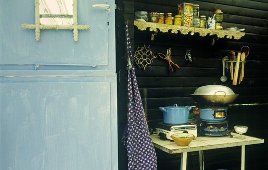 Et simpelt udekøkken, et anneks med soveværelse og badeværelse samt en cirkusvogn på hjul har været løsningen. Isolering er der heller ingen af, men det er nærmest en fordel - de sorte udvendige brædder gør, at huset bliver varmet hurtigt op af solen.