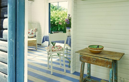 Den første sommer brugte Lise Lotte på at male. Indvendige cigarkassevægge og -lofter blev hvide, og gulvet blev malet i striber med træbeskyttelse - i en delikat lyseblå og en kittet hvid.