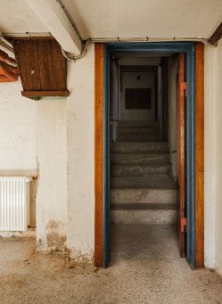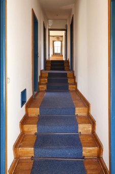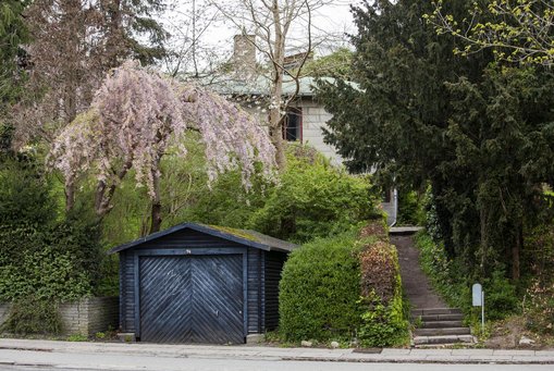 Huset ligger højt hævet over vejen på en skråning med ikke mindre end 9 niveauspring og 13 indvendige trapper. Når du træder ind på grunden, passerer du først indgangen til kokskælderen, mens du skal bestige en række trapper, før du når op til hovedindgangen.