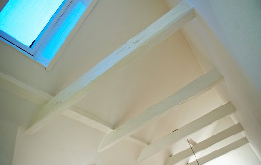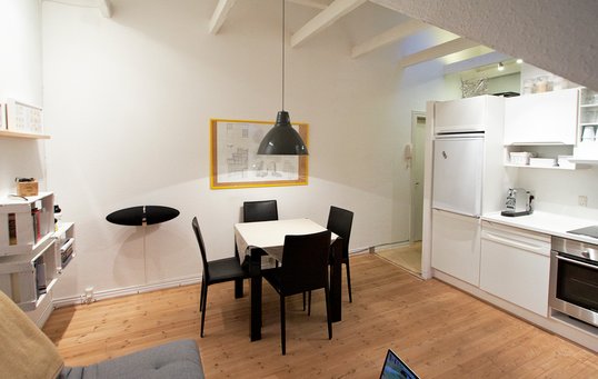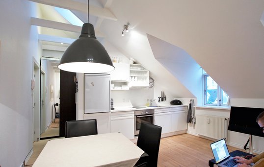 Resultatet er, at tagvinduet over entréen nu sender lys ind i lejligheden, der i dag hænger sammen som ét stort rum (dog med separat badeværelse). Samtidigt er der åbent til kip med frie hanebånd, der er malet hvide lige som det meste af lejligheden.