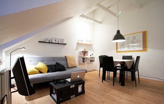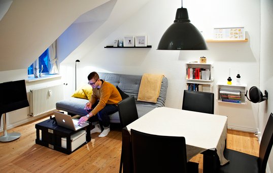 I dag fremstår de 28 kvadratmeter rummelige, omend Kresten Bjerre Basse godt kunne ønske sig et separat rum at sove i.