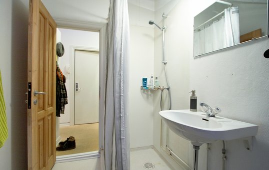 Også badeværelset er rummeligt med plads til bruseniche og hylder med toiletsager og håndklæder.