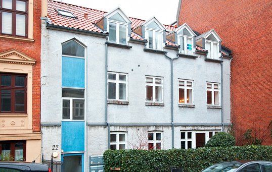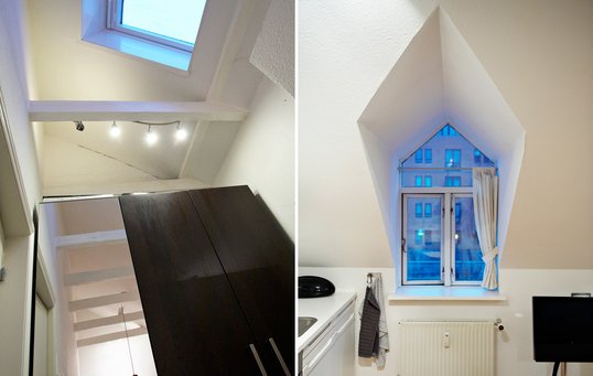 Renoveringen af den 28 kvadratmeter store studielejlighed i centrum af Aarhus indebar nedbrydning af væg og hems/tag over entré, samt fjernelse af dør mellem entré og stue. Det fritlagde et tagvindue, som i dag giver lysindfald til resten af lejligheden.