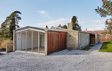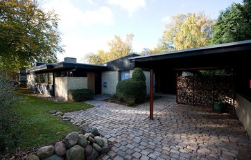 Nu er den lukkede garage blevet til en åben carport. Bertel Udsen er blevet kaldt enfamiliehusets fader. I sit eget hus legede han med mange af de idéer, som han senere gentog i de parcelhuse, han nåede at tegne til andre. Carporten her er forløber for en af de mest almindelige konstruktioner i Danmark: fire stolper, et fladt tag, hvorunder bilen kan holde, og ofte suppleret med et redskabsrum den ene ende. Foto: Jakob Bekker-Hansen / Realdania By & Byg