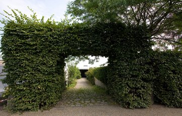 Ved Arne Jacobsens første hus til sig selv og familien er selve adgangen til huset en meget markant indkørsel til garagen. Idéen med at ankomme standsmæssigt til sin bolig er en reminiscens fra palæerne og herregårdenes tid, som er overført til dette på denne tid meget moderne og funktionalistiske hus. Foto: Per Munksgård-Thorsen og Lars Degnbol / Realdania By & Byg