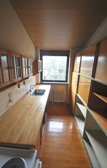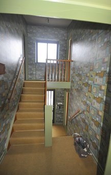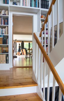Trapper er der masser af, møblerne og gulvene er af solide danske træsorter, og broderierne er udskiftet med buster af blandt andet en helfigur af en nøgen Afrodite, diskrete Tintin-figurer og design fra både Danmark og udland.