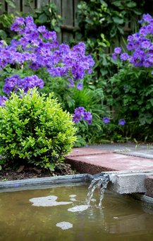– Vores yndlingssted i haven er stenterrassen. Her får vi naturlig skygge fra dronningebusken og har samtidig udkig til bassinet, hvor kilden giver en beroligende rislen. Kilden løber i betonrender, som jeg har støbt, og i enden af renden er der monteret en zinkkam, som kan justere lyden, fortæller Lars.