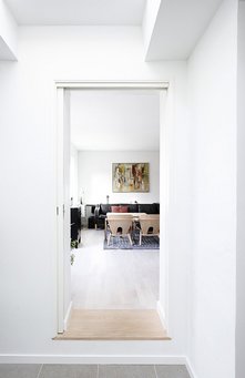 Kig fra køkkenets spiseplads ind til opholdsstuen og gennem skydedøren til den nye stue i tilbygningen. Foto: Christina Kayser Onsgaard