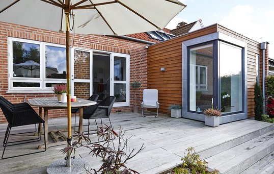 - Bryd med materialerne, så tilbygningen f.eks. fremstår med let facadebeklædning i træ i forhold til en tungere murstensfacade på rækkehuset. Proportionerne i døre og vinduer kan dog stadig hænge sammen.